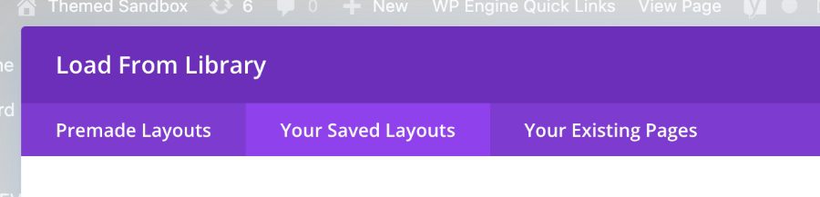 For ease of use, all sections (layouts) currently built on the site, and shown on the Layouts Example page, have been saved into the Divi Library. You can pull sections from the Divi Library but you will not be able to access the library to modify the elements within layouts.